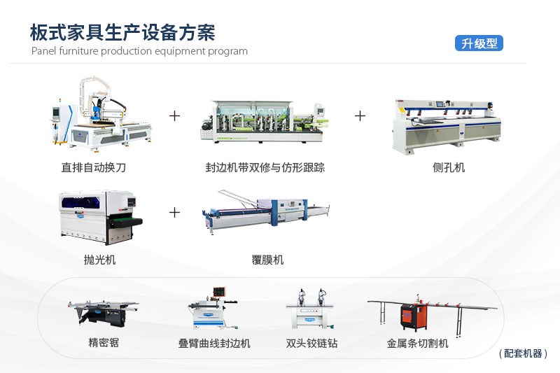 柜體/柜門(吸塑/平板)生產(chǎn)解決方案主要由直排換刀加工中心、封邊機(jī)、側(cè)孔機(jī)、拋光機(jī)、覆膜機(jī)、精密鋸、疊臂封邊機(jī)、雙主軸鉸鏈鉆、金屬條切割機(jī)組成,可滿足全屋定制廠家的生產(chǎn)加工,機(jī)器組合靈活,工藝多變,打造符合客戶整廠需求的自動(dòng)化生產(chǎn)模式。